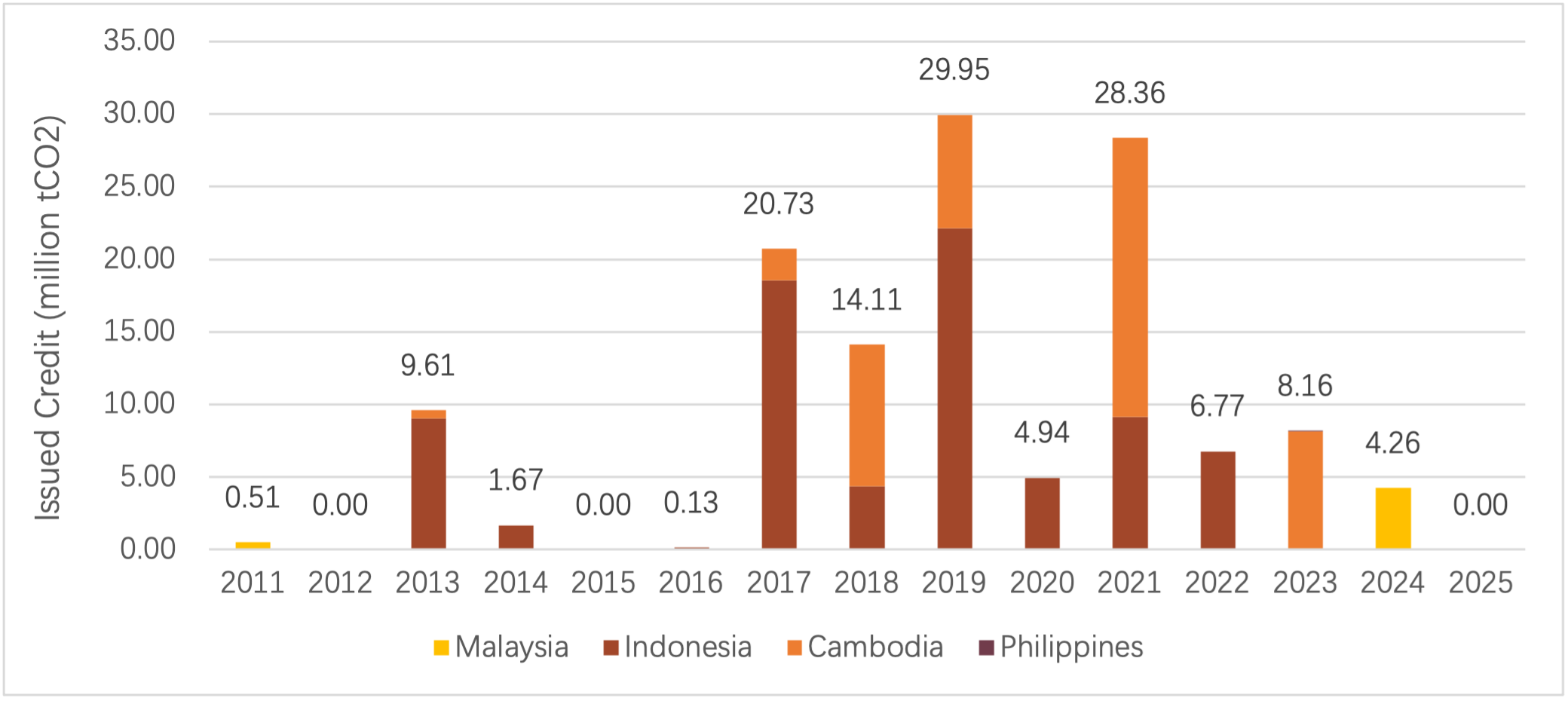 Indonesian projects have not issued credits since 2022 amid regulatory changes., though recent progress with major standards show signal towards reopening of international issuance.