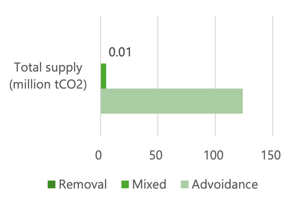 Removal and mixed nature credits (such as IFM combining both avoided emissions and carbon removal) show better retirement performance, and lower supply. Removal credits have a higher retirement rate of 78%, followed by mixed (68%) and avoidance (66%) [Footnote 5], reflecting buyer preference in emissions offsetting, potentially sparked by reporting frameworks like the Science Based Targets initiative (SBTi), giving more importance to this type of credits for offsetting [13].
